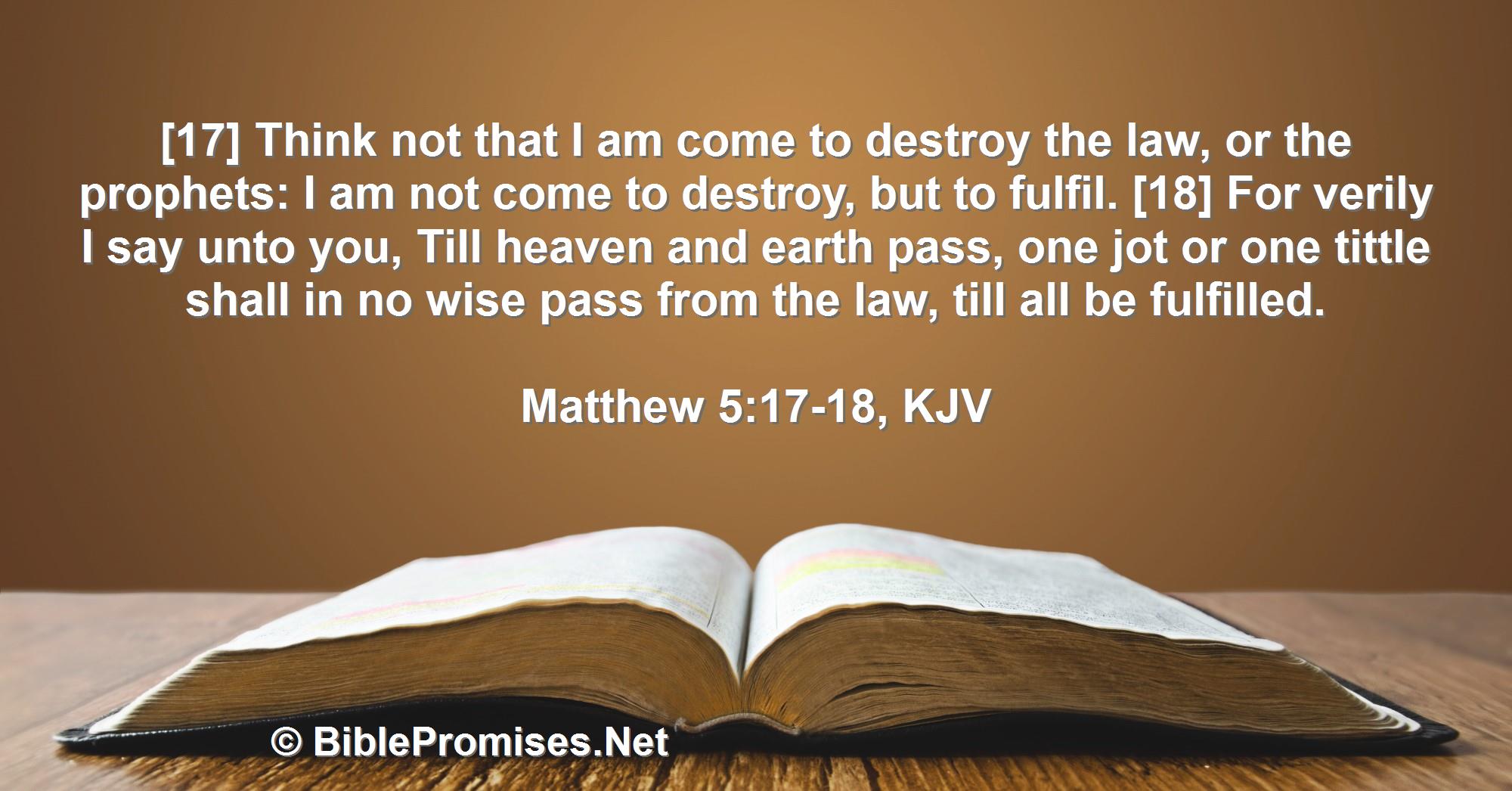 [17] Think not that I am come to destroy the law, or the prophets: I am not come to destroy, but to fulfil. [18] For verily I say unto you, Till heaven and earth pass, one jot or one tittle shall in no wise pass from the law, till all be fulfilled.
