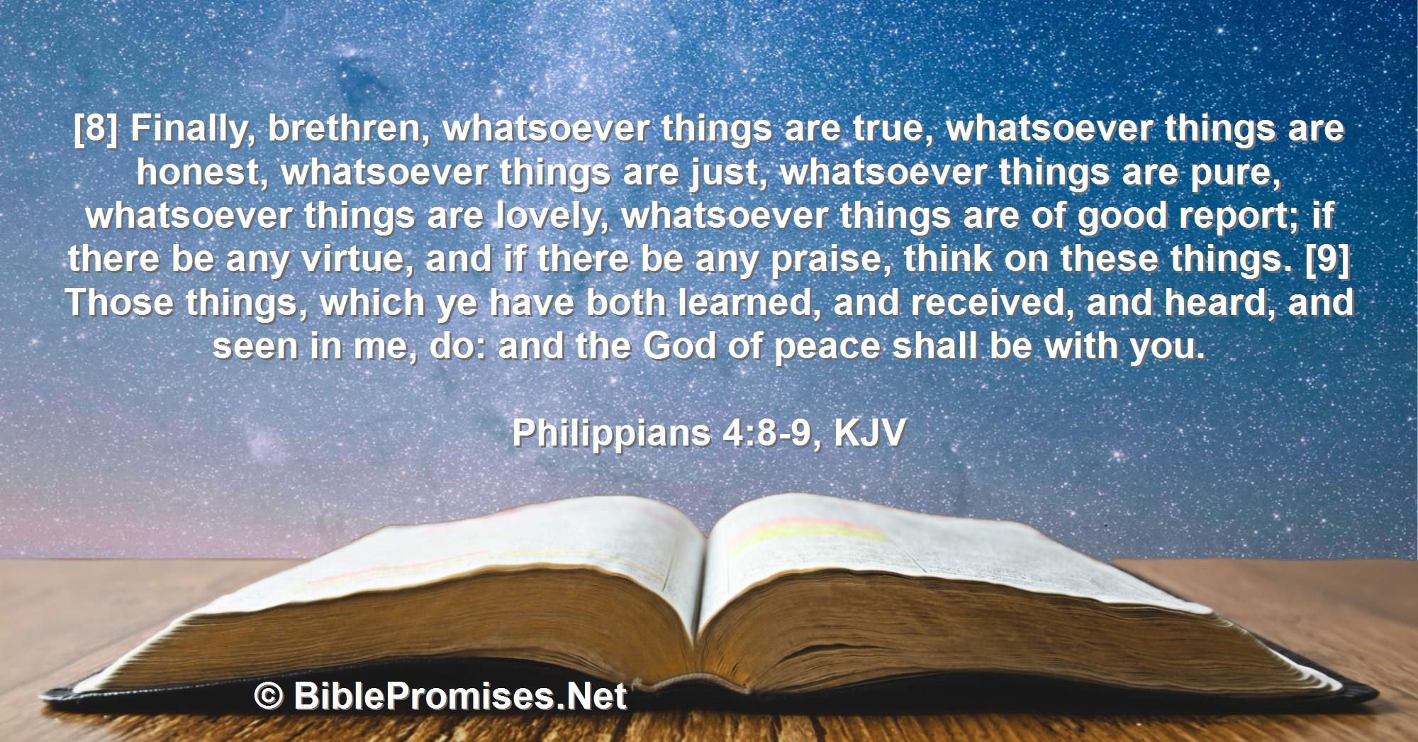 [8] Finally, brethren, whatsoever things are true, whatsoever things are honest, whatsoever things are just, whatsoever things are pure, whatsoever things are lovely, whatsoever things are of good report; if there be any virtue, and if there be any praise, think on these things. [9] Those things, which ye have both learned, and received, and heard, and seen in me, do: and the God of peace shall be with you.