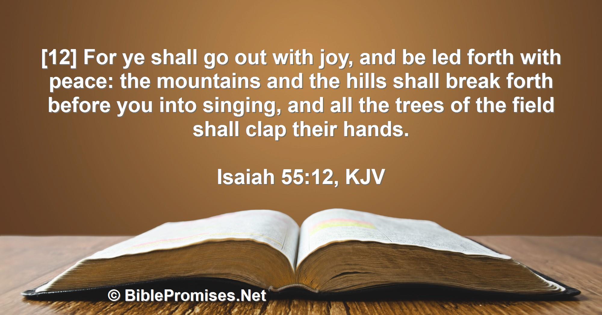 [12] For ye shall go out with joy, and be led forth with peace: the mountains and the hills shall break forth before you into singing, and all the trees of the field shall clap their hands.