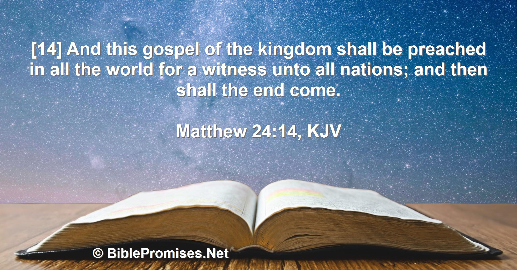 Verses:[14] And this gospel of the kingdom shall be preached in all the world for a witness unto all nations; and then shall the end come.