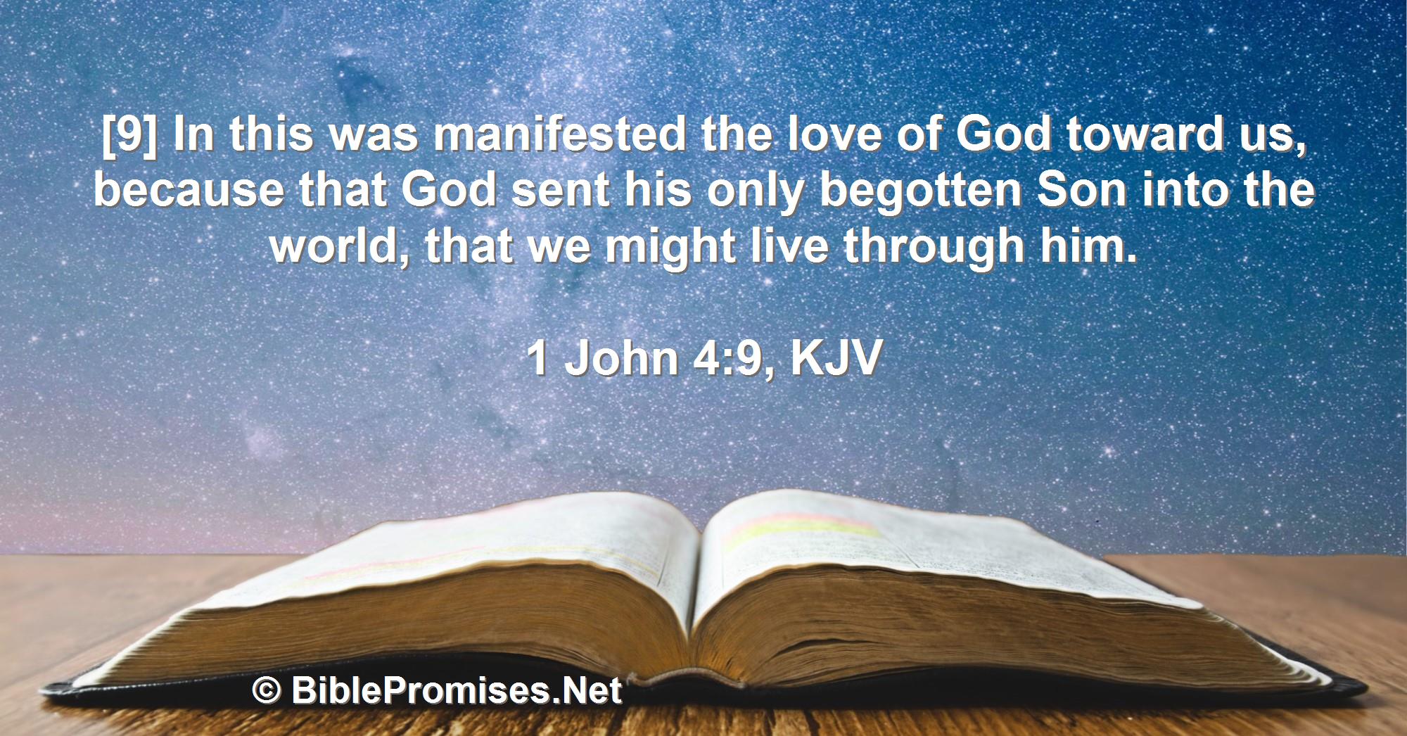 Keywords:Bible, promise, manifested, love, of, God, toward, us, sent, his, only, begotten, Son, into, world, that, we, might, live, through, him