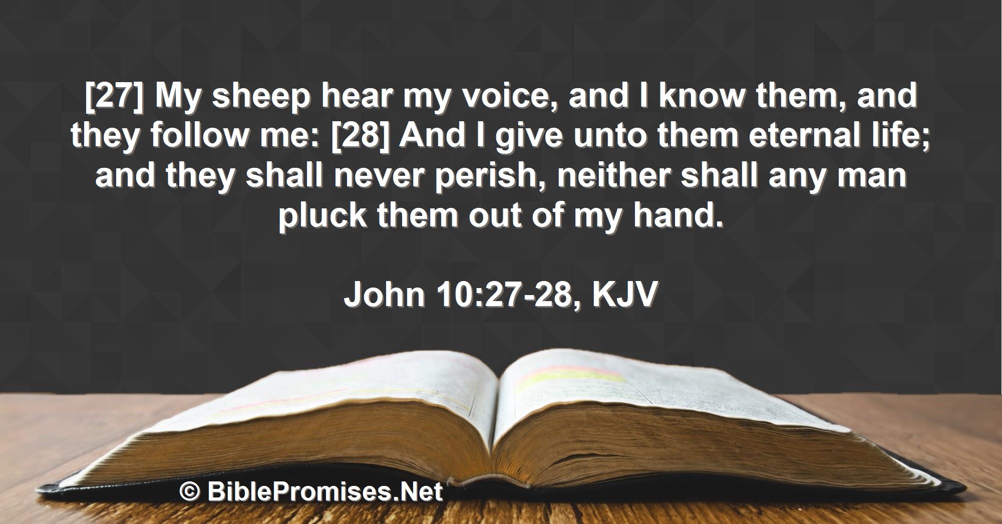 Verses:[27] My sheep hear my voice, and I know them, and they follow me: [28] And I give unto them eternal life; and they shall never perish, neither shall any man pluck them out of my hand.